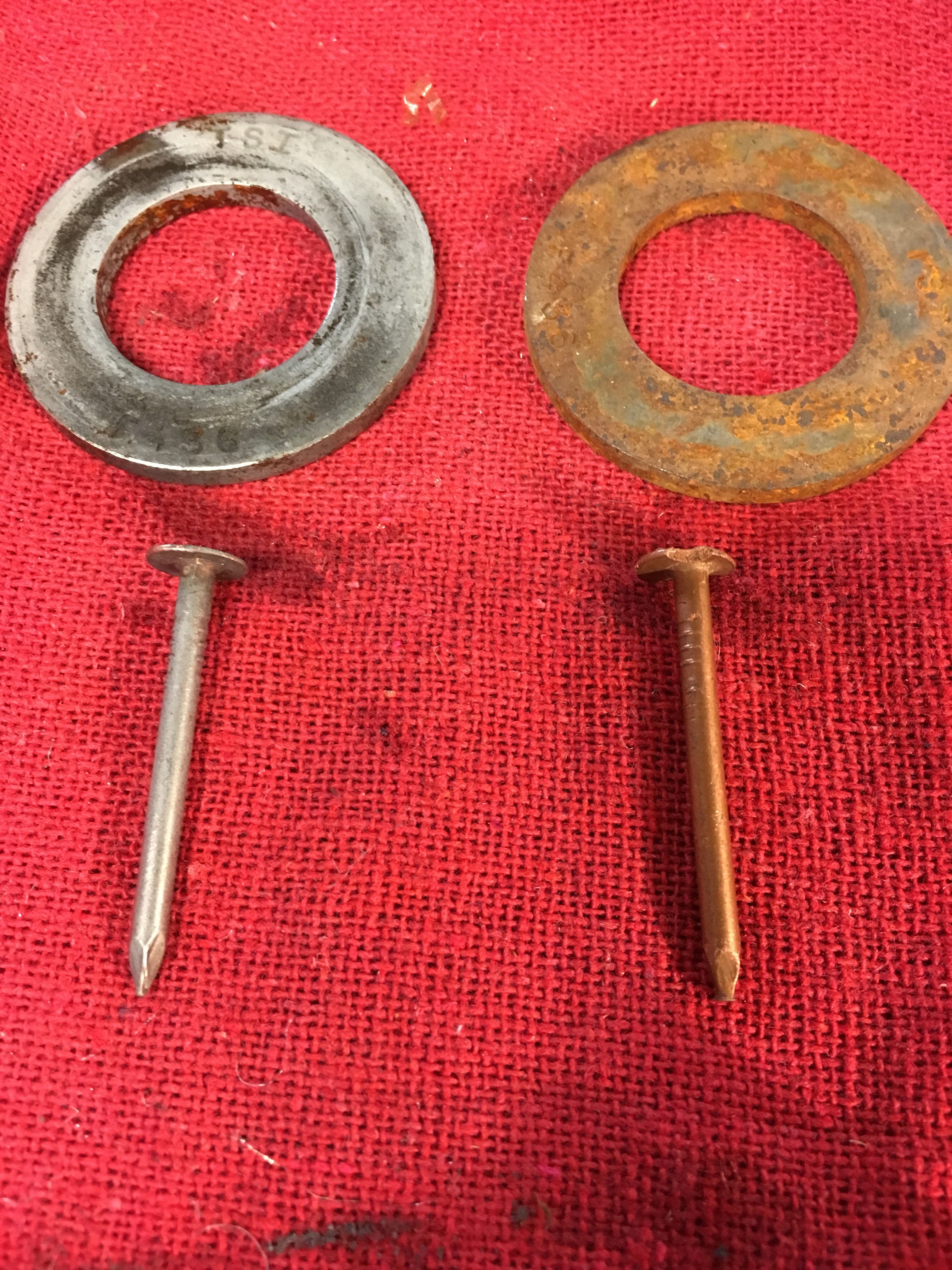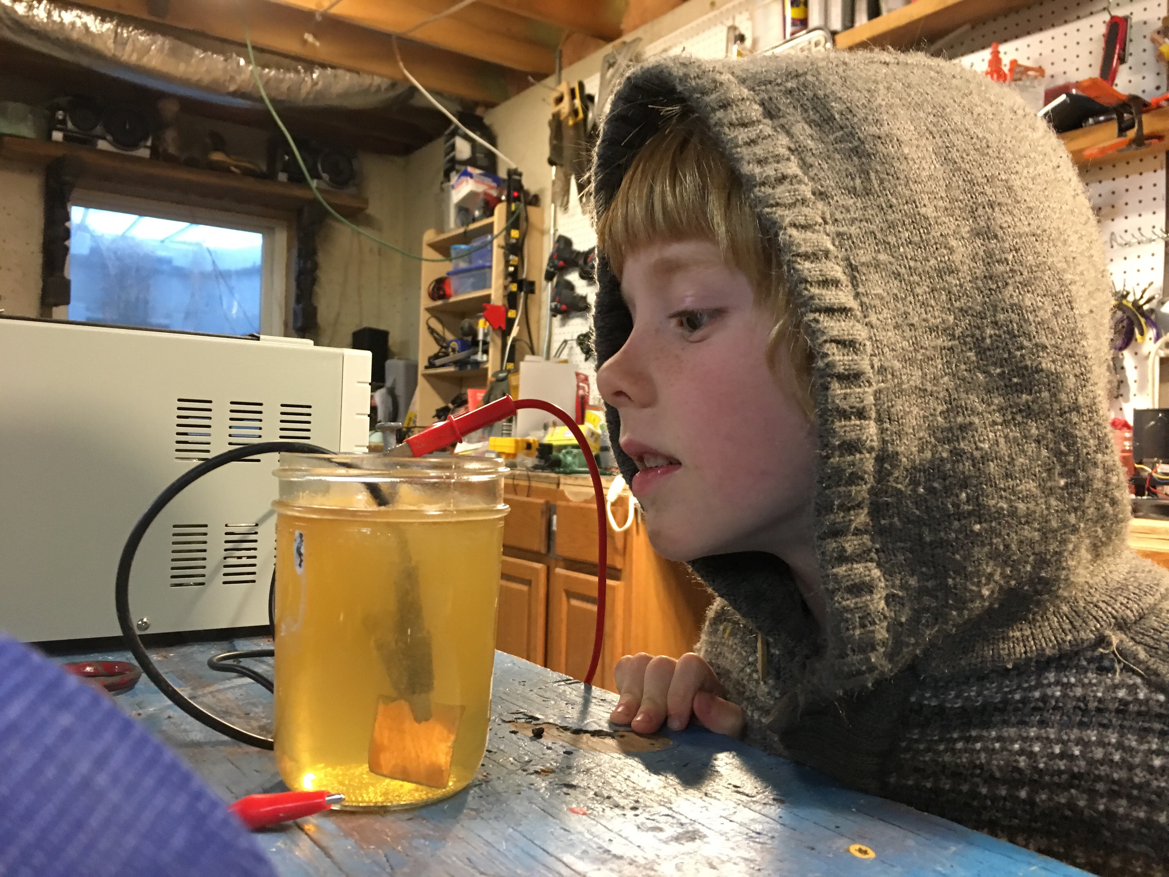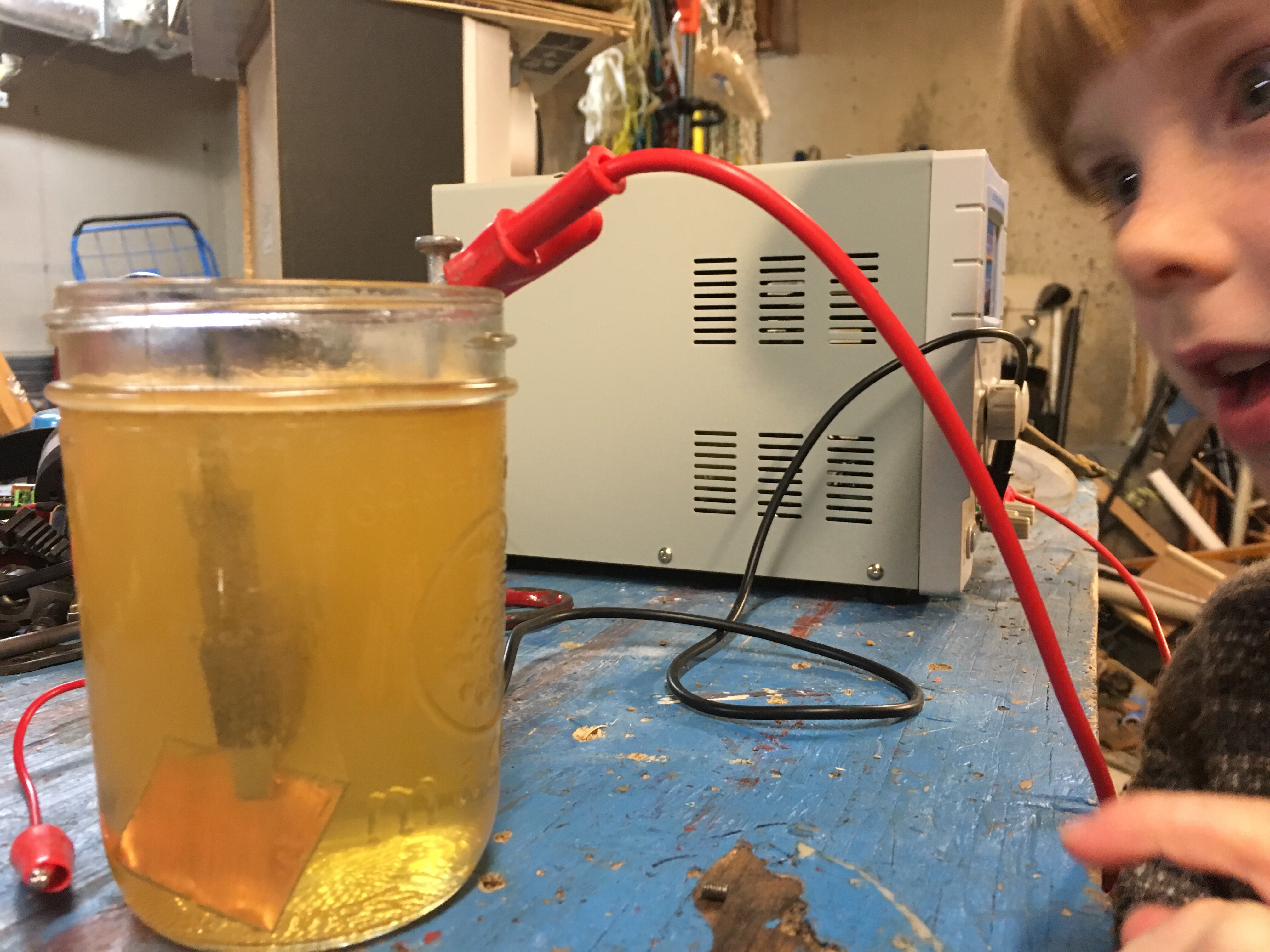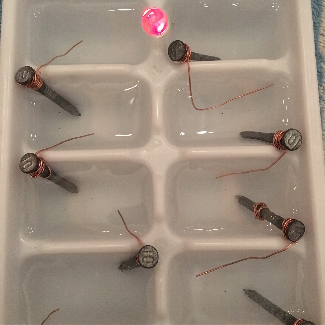 Last week we made a battery with an ice cube tray, vinegar, copper wires, and galvanized nails. After the experiment Able put all the nails in a jar with vinegar and dissolved the zinc off. The solution turned a copper color. He’s been asking to electroplate things with his zinc solution for a week, so tonight we set up the power supply, added sugar and salt to the zinc vinegar solution, and ran a few copper nails and odd steel washers through the process. Amazing to watch the zinc come out of solution and deposit on the metal parts. Also noticed how quickly rust dropped off steel when hooked up to the negative electrode and placed in the vinegar.