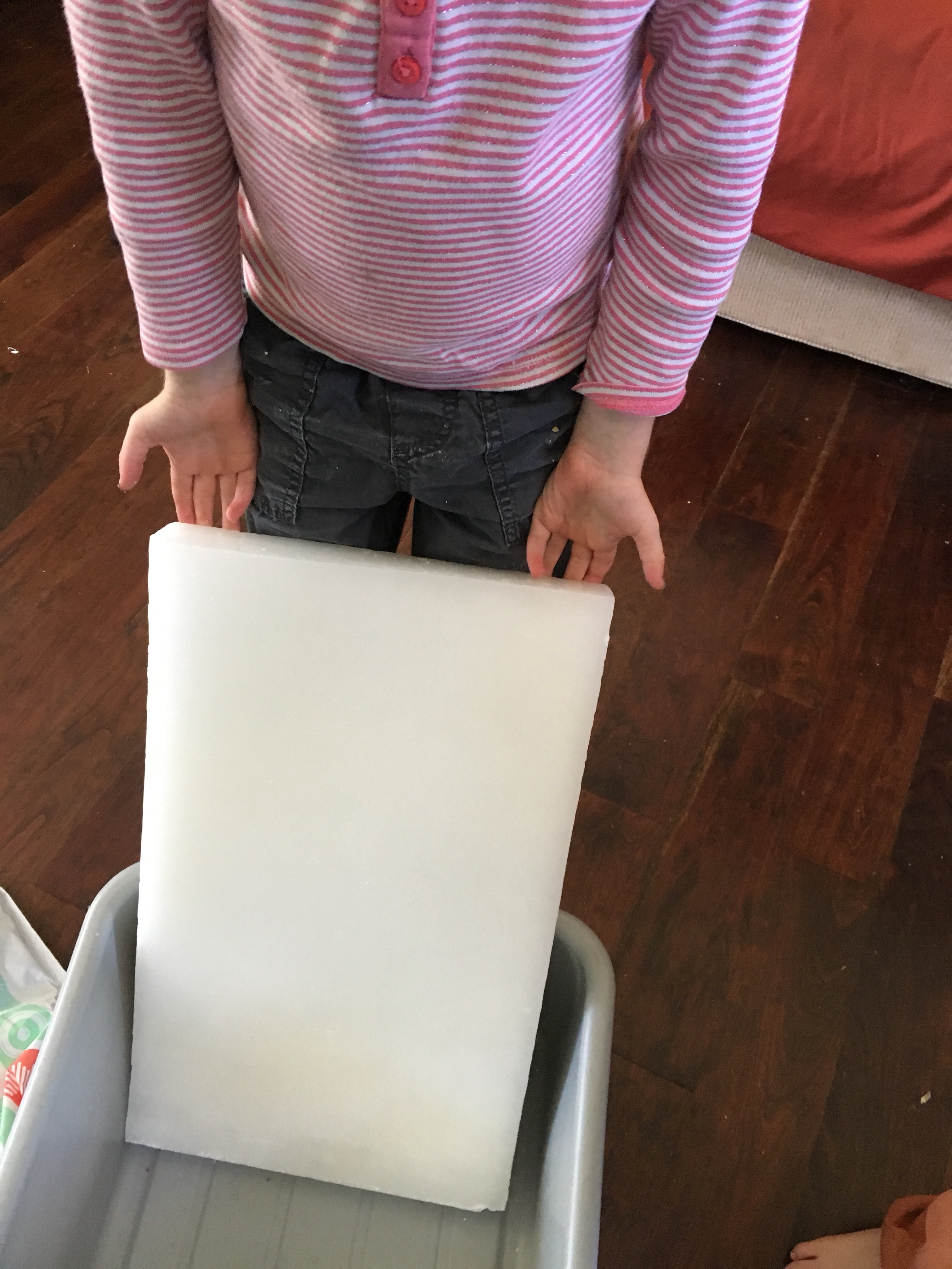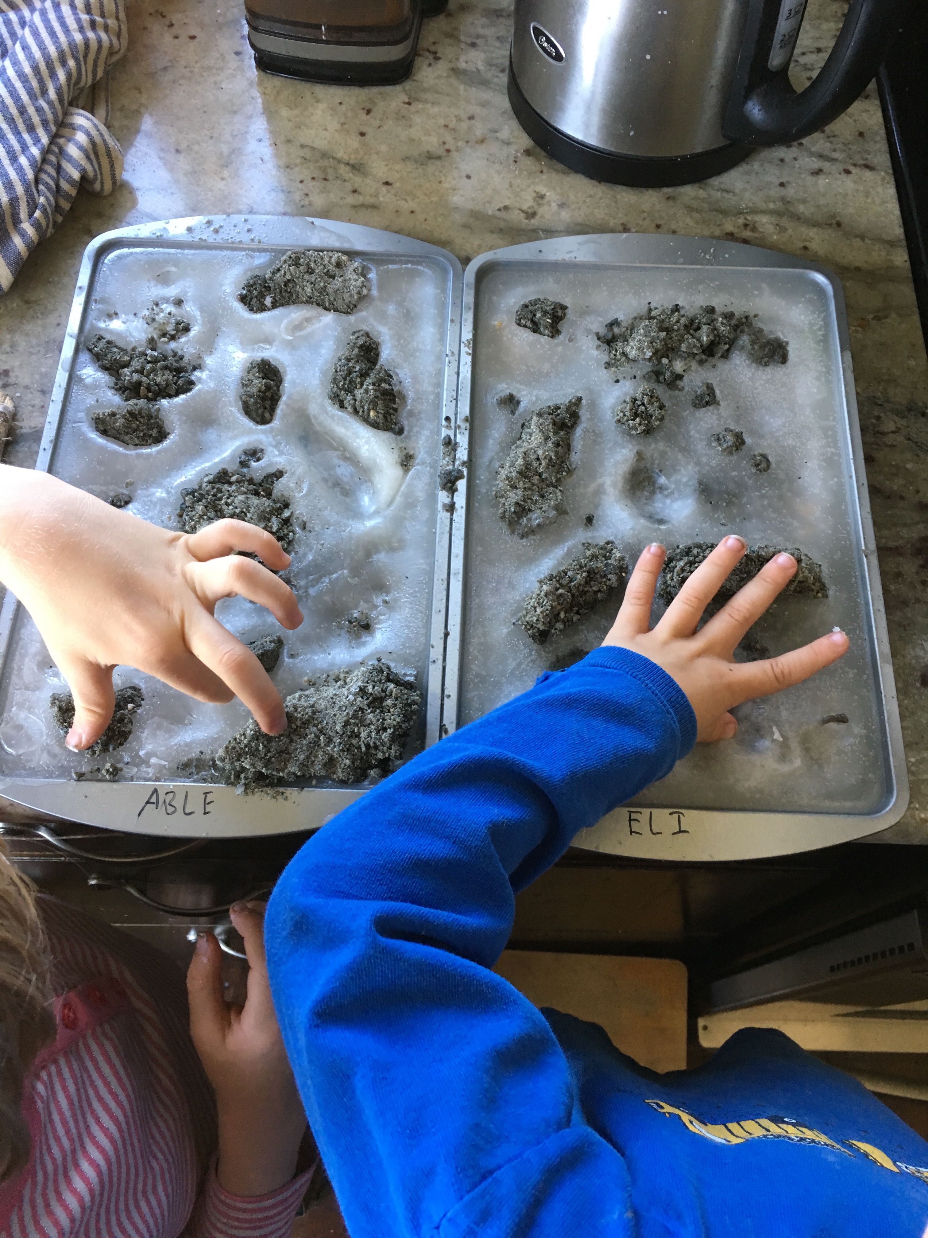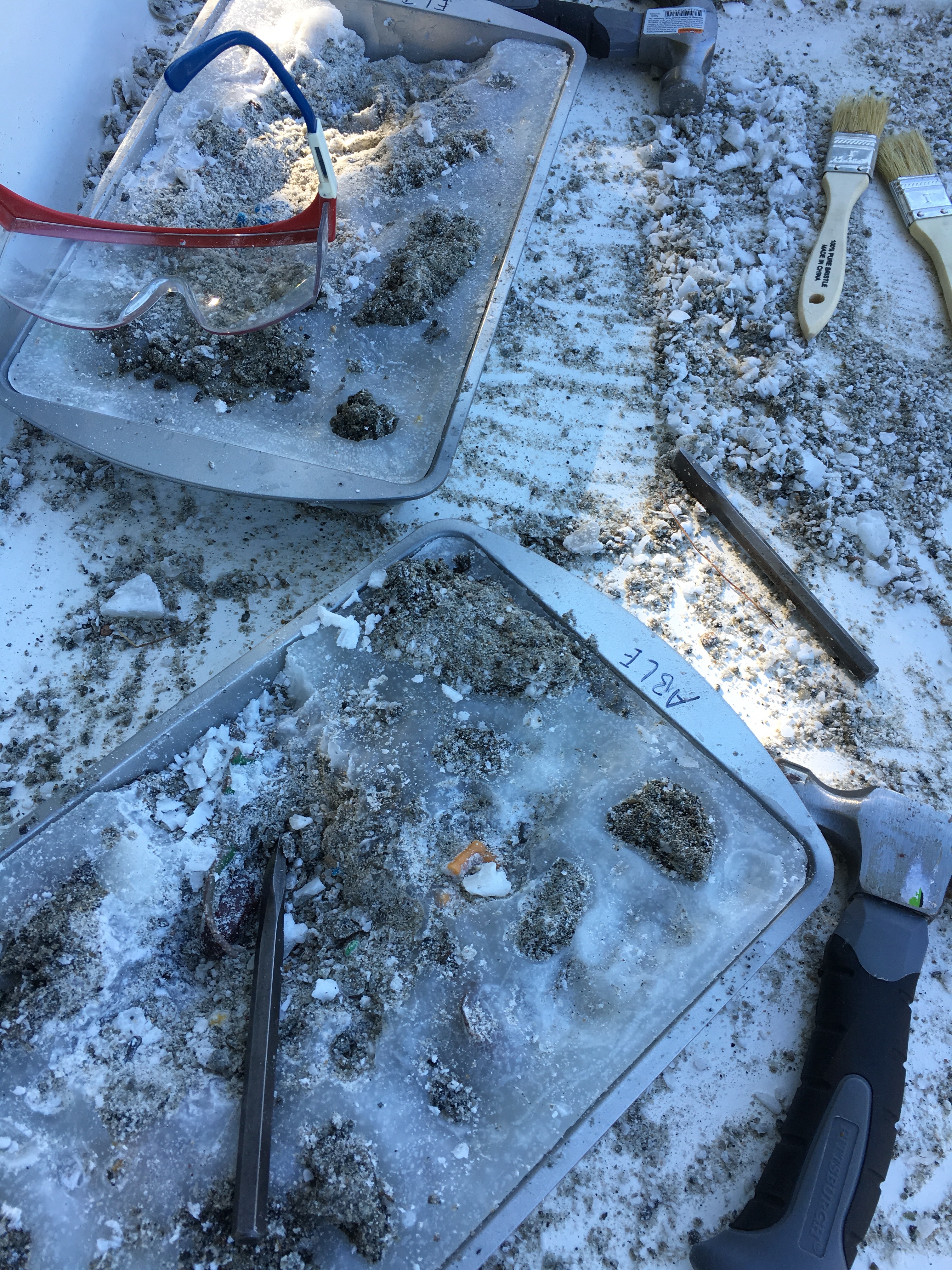 It definitely takes time and some effort to uncover the fossils, but an activity that the kids can use for a few weeks was the point. We place the pans inside a larger tray to catch the wax so we can remelt it all again in the future.
