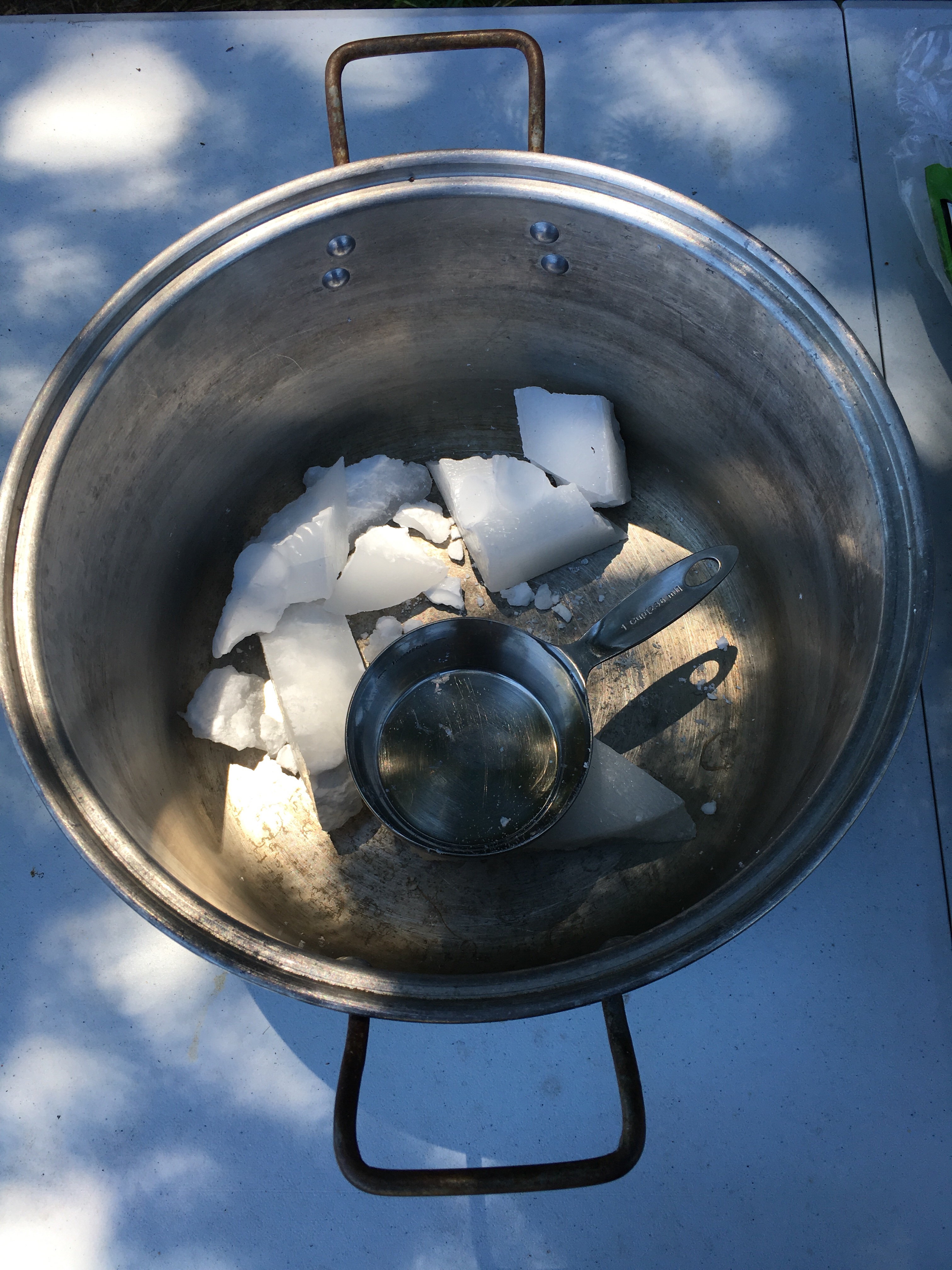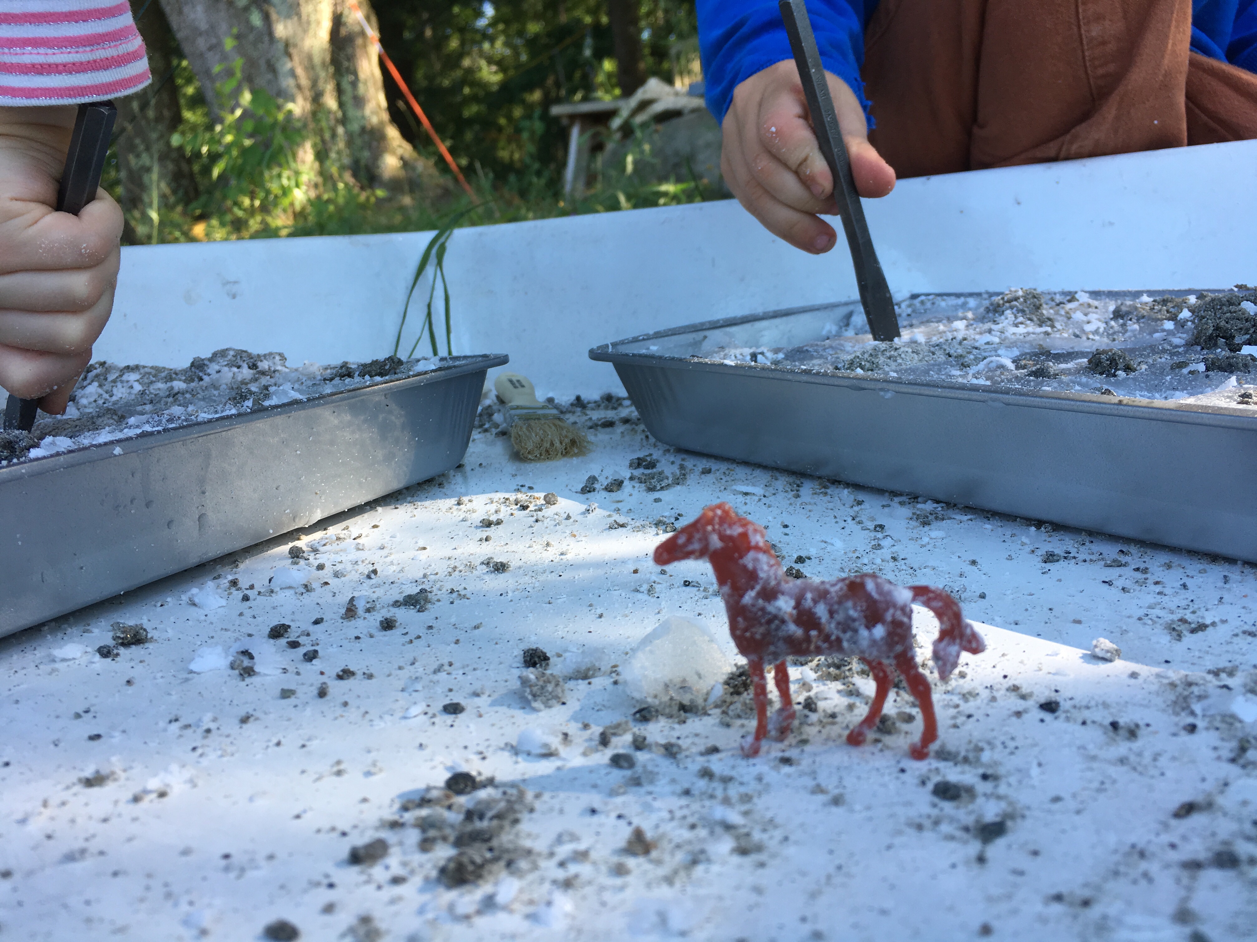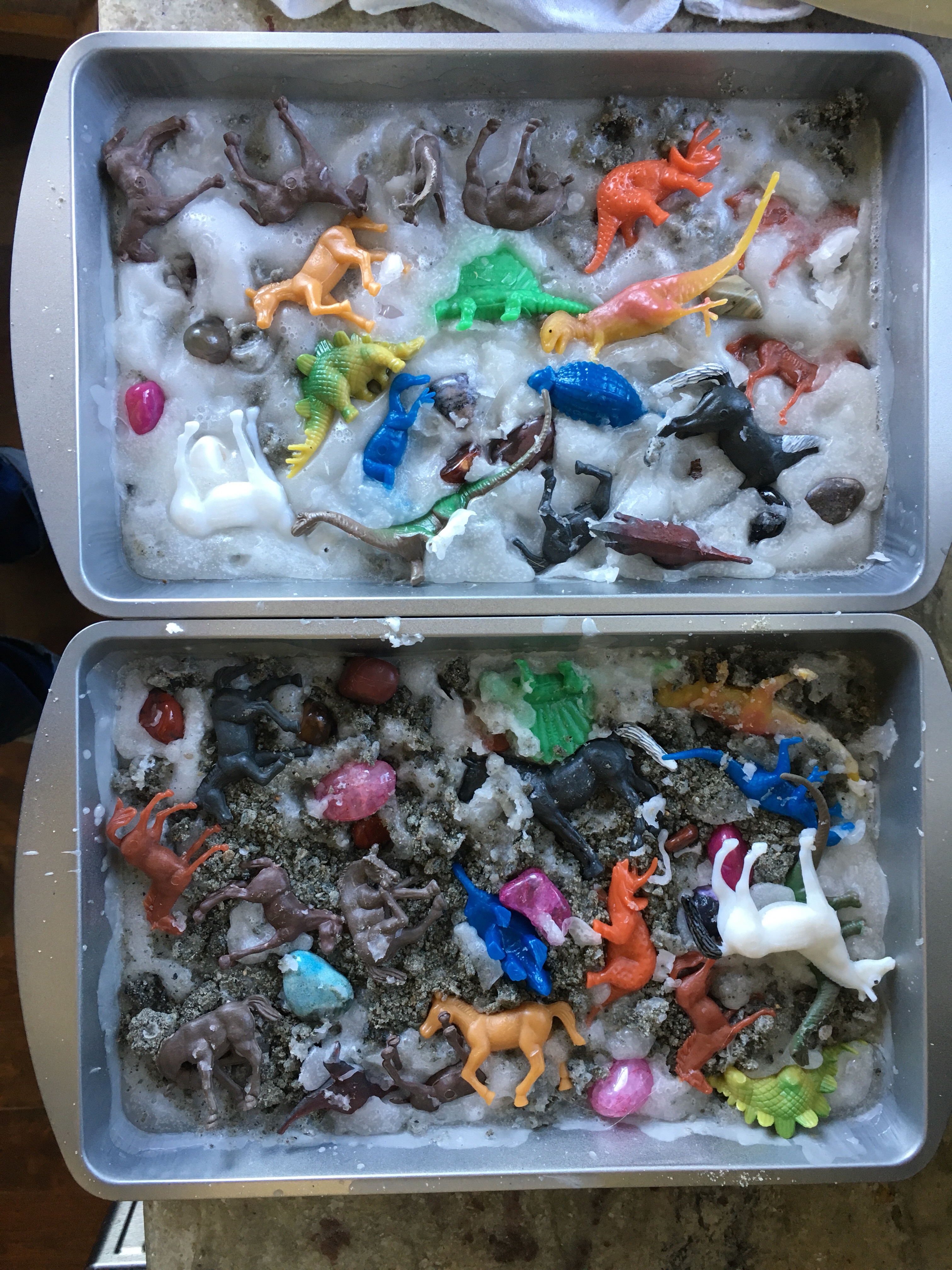 A 50% off coupon from AC Moore bought us a cheap 10lb block of paraffin wax. The sand is all purpose sand from Lowes. The dinos, horses, and brownie pans are from the dollar store. 6 cups of sand to 2 1/2 lbs of wax was enough to fill both pans. We added one layer then squished the critters into it, followed by another layer over it all.