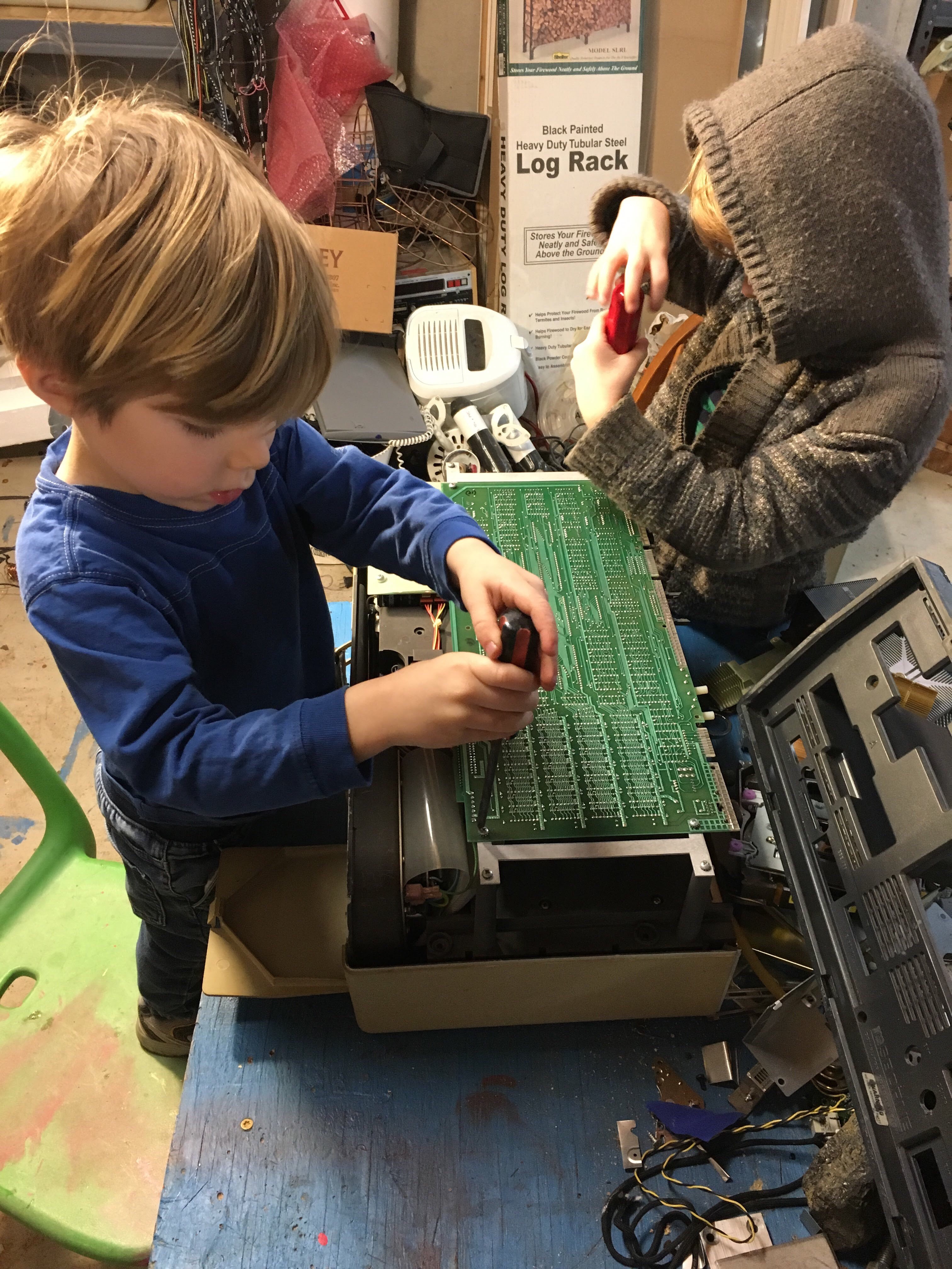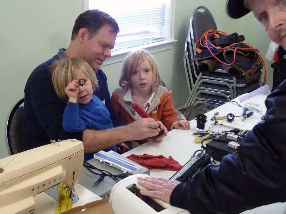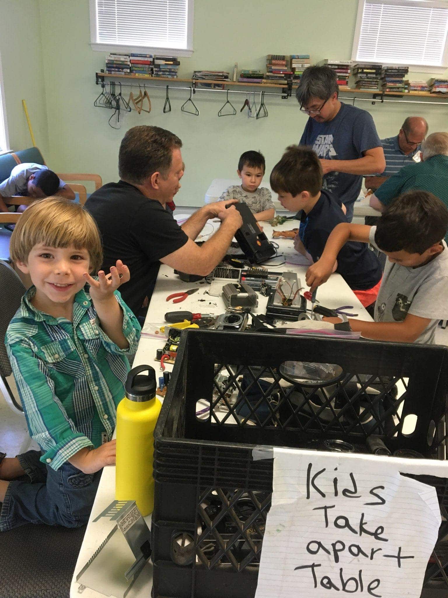 Our family has volunteered at a local repair cafe for nearly two years. Every other month, we gather at a senior center in Warwick and offer to repair and fix things people bring in, for free. Raheli mends and adjusts clothes and fixes the occasional stuffed animal, and the kids and I run a take-apart table. The table is mostly for kids, but I’ve had adults come and break into something just for the fun of it. The table is intended to give kids permission to do something that many are naturally curious about; take a tool to something just to see what’s inside. It’s also a good way for kids to get practice with tools, develop dexterity, and learn how things are put together. I have a collection of batteries on hand so the kids can make motors run, light up LEDs and otherwise activate things.