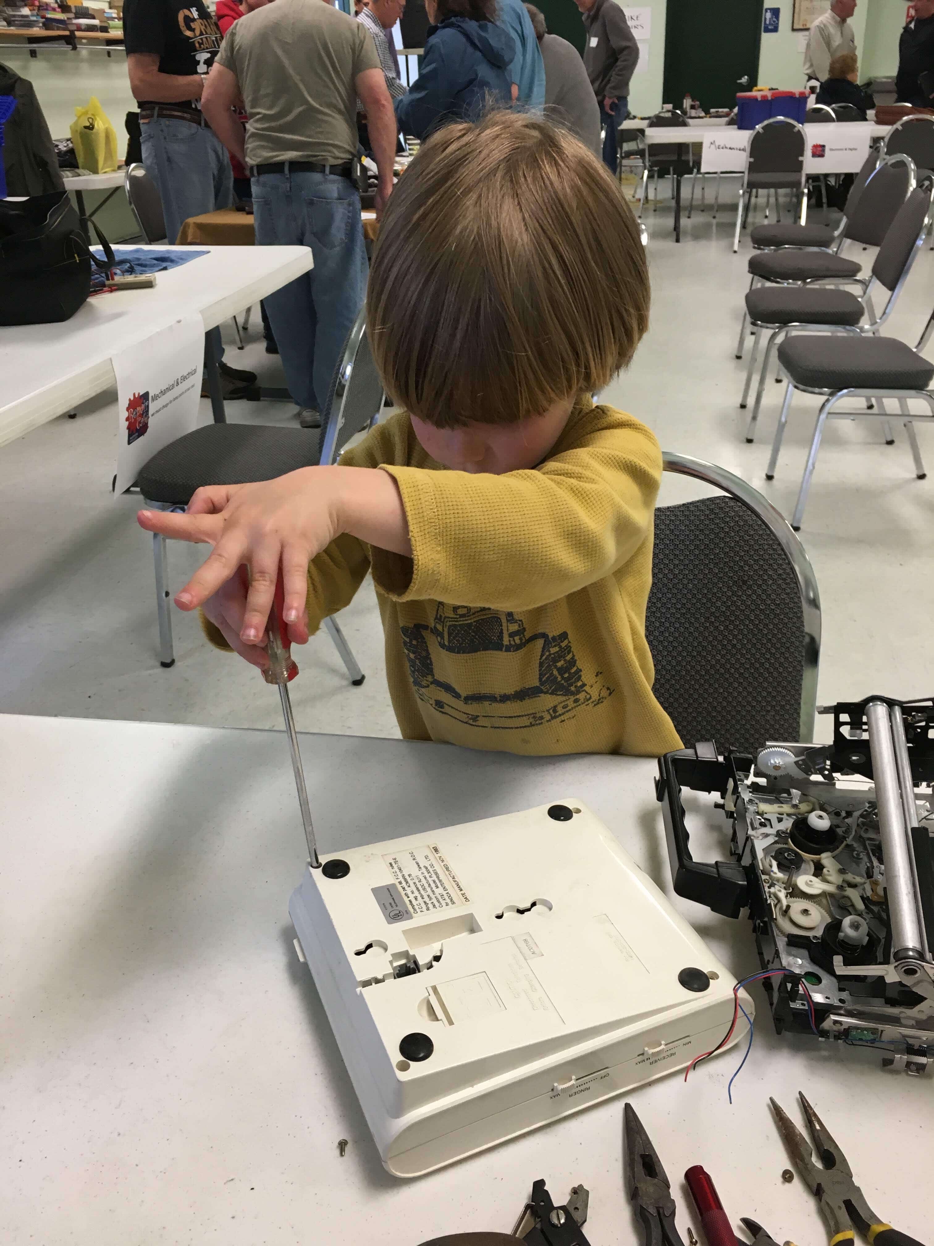 I collect old cameras, tape decks, hard drives, sewing machines, radios, power tools, etc., mostly from people tossing them during bulk garbage week. Most get taken apart in our basement, but some we put aside for the repair cafe. We usually only get a handful of kids at the table, and otherwise it’s me and the kids working through a few things and assembling small machines with the motors, wires, switches, LEDs, and other parts we harvest. I think the kids really enjoy it, and seeing little kids be proficient with screwdrivers, pliers, wire strippers, etc. really gets people’s attention.