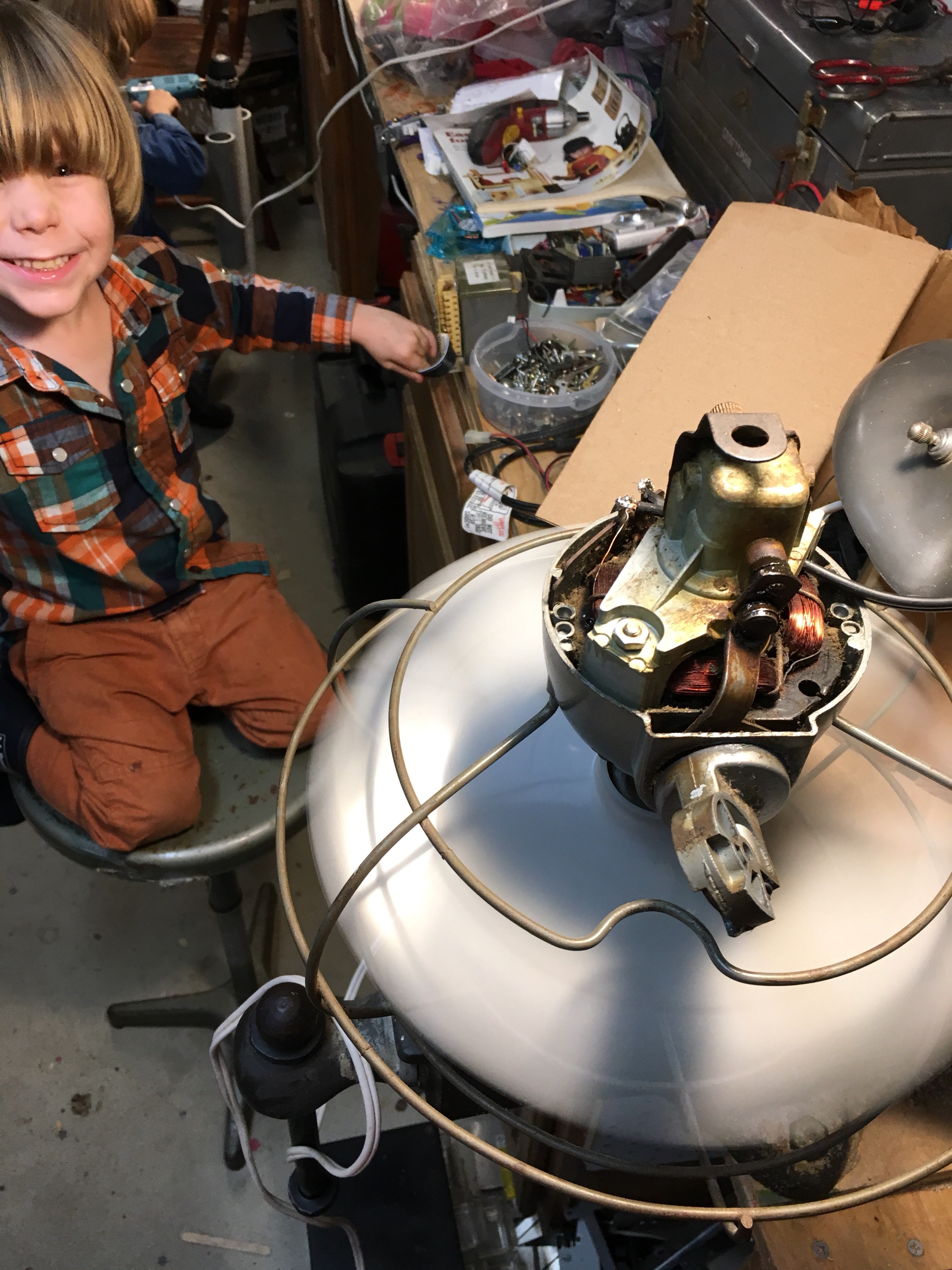 Today we decided to not only harvest motors from an old inkjet printer/scanner, but fix/rewire two mid-century desk fans. We had to finish the repairs at home since they required soldering and I hadn’t brought our soldering station to the repair cafe. Each kid wanted to help me with a fan. Able went so far as insisting that he replace a rusty bolt and nut in his, which required cutting the new bolt to length with the table vise and a hacksaw.